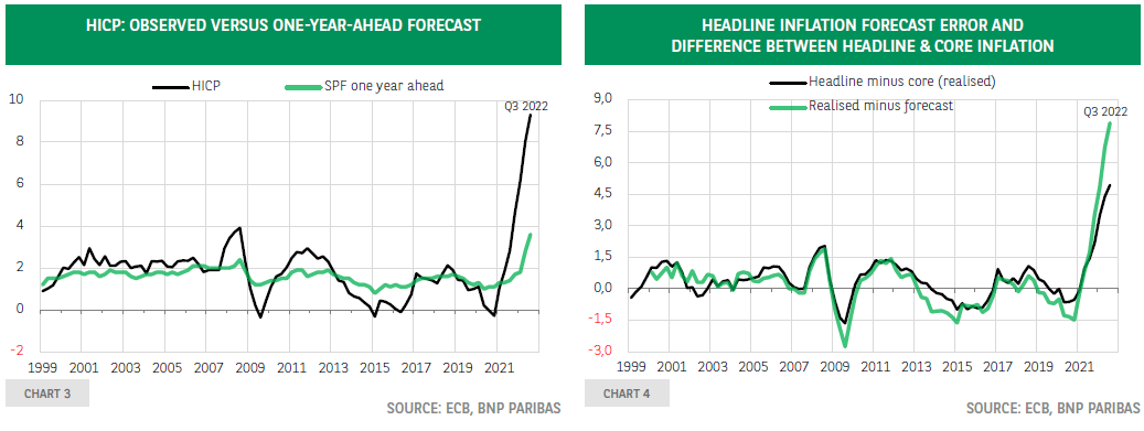 在试图回答通胀预测的可靠性问题时,我们可以先看看这些预测的历史。 图3显示,未来12个月的整体通胀预测受到当前通胀的强烈影响,即前12个月的价格上涨速度。 预测的波动比观察到的通胀要小。 在后者的重要波动中,能源价格冲击发挥了很大作用。 这也解释了为什么通胀预测误差与总体通胀和核心通胀之间的差异高度相关(图4)。 这意味着,假设能源和食品价格没有新的冲击,焦点应该放在核心通胀上。 不幸的是,核心通胀SPF的历史只能追溯到2016年第四季度,因此在通胀下降的情况下,这段时间太短,无法对预测的质量进行适当评估。