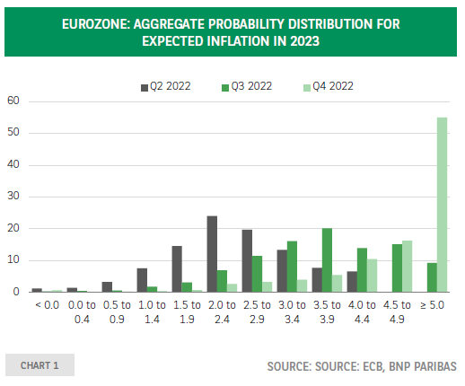 欧洲央行对专业预测者的最新调查(SPF)提供了发人深省的解读。 经济增长预期被向下修正——实际国内生产总值(GDP)预计将在今年第三、第四季度和明年第一季度下降——通胀预期也被向上修正。 此外,尽管欧洲央行的政策利率大幅上升,金融状况不断恶化——主权债券收益率上升,公司债券利差扩大,股票市场下跌,贷款条件收紧——基于预测分布对通胀前景的不确定性继续增加,预计明年通胀率超过5%的调查参与者的百分比大幅上升(图1)。