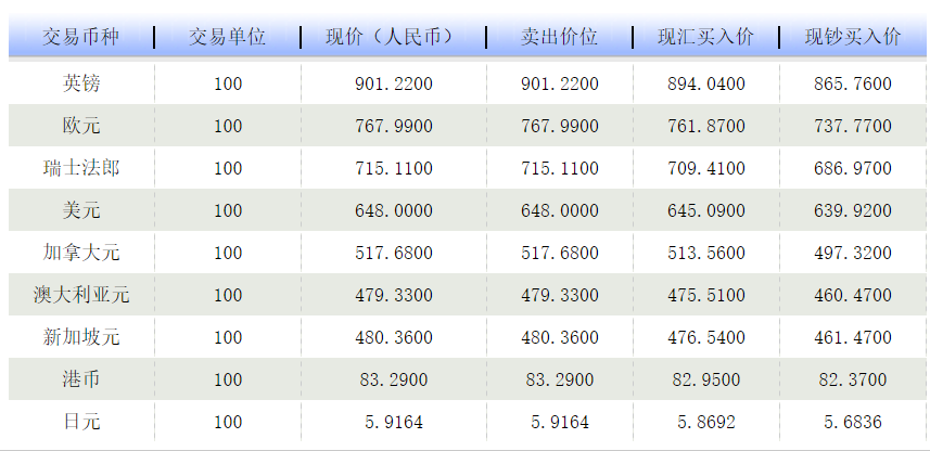 中国外汇交易中心8月3日受权公布人民币对美元、欧元、日元、港元、英镑、澳元、新西兰元、新加坡元、瑞士法郎、加元、林吉特、卢布、兰特、韩元、迪拉姆、里亚尔、福林、兹罗提、丹麦克朗、瑞典克朗、挪威克朗、里拉、墨西哥比索及泰铢的市场汇价。 8月3日人民币汇率中间价如下: 100美元646.1人民币 100欧元767.14人
