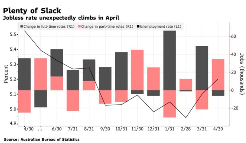 分析人士指出,在澳大利亚4月份就业报告公布后,外汇市场已开始预计澳洲联储下一步举措。该报告显示,全职就业人数下降,将失业率从3月份的5.1%推至5.2%。澳洲联储上周并没有实行降息,并明确表示,他们认为当前通胀率过低,劳动力市场依然疲软。现在失业率上升,更加深了市场对6月降息的预期,并将澳元打压至更低。