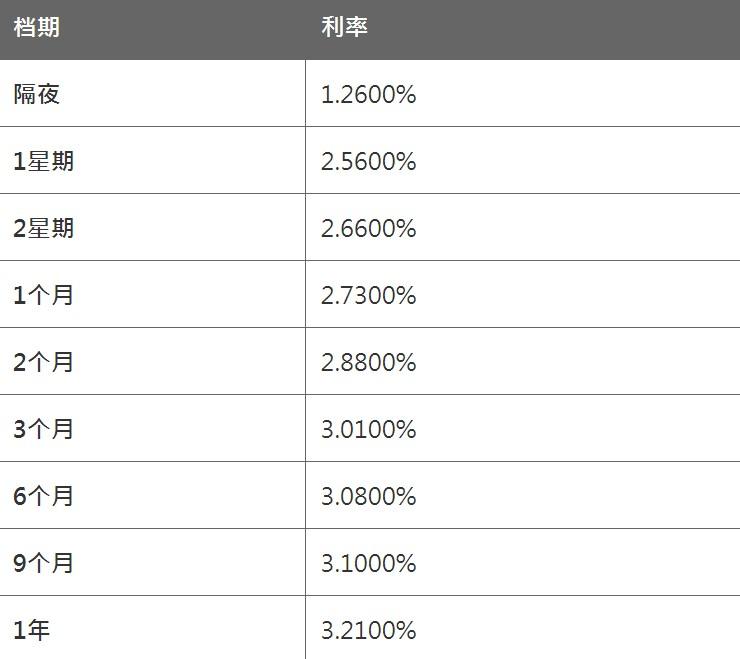 3月2日香港银行同业人民币HIBOR: 隔夜HIBOR报1.2600%,一周期HIBOR报2.5600%,两周期HIBOR报2.6600%; 1个月HIBOR报2.7300%,2个月HIBOR报2.8800%,3个月HIBOR报3.0100%。 注:上述资料仅供参考,人民币拆息将根据本行不时公布的息率为准。