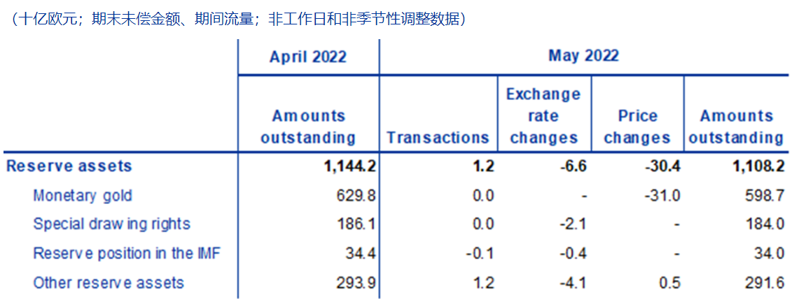 2022年5月,欧元体系的储备资产存量从上个月的11442亿欧元降至11082亿欧元(表3)。这一下降是由负价格变化(304亿欧元,主要是由于货币黄金价格下降310亿欧元)和汇率变化(66亿欧元)推动的,部分被资产净收购(12亿欧元)所抵消。