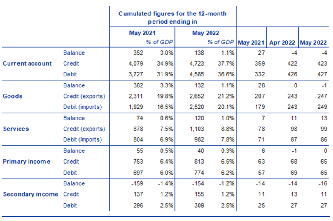 截至2022年5月的12个月内,经常账户盈余为1380亿欧元(占欧元区GDP的1.1%),低于一年前的3520亿欧元(3.0%)