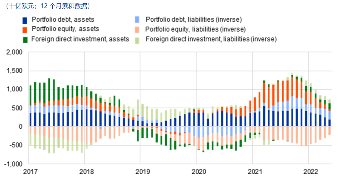 在金融账户中,截至2022年5月的12个月内,欧元区居民对非欧元区证券投资证券的净收购总额为2390亿欧元,非居民对欧元区证券投资证券的净销售额总额为100亿欧元