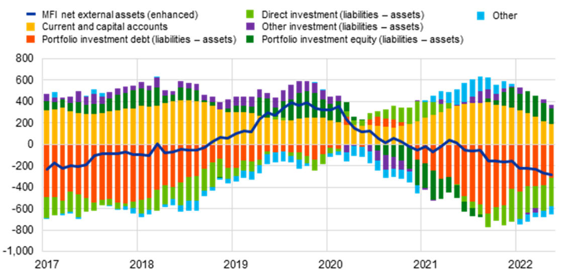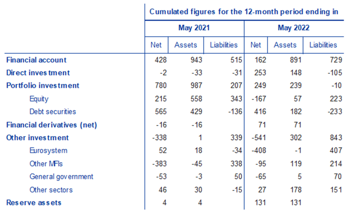 在其他投资方面,欧元区居民在截至2022年5月的12个月内净收购非欧元区资产达3020亿欧元(在截至2021年5月的12个月内净收购10亿欧元之后),而他们的净发生额为负债增加到8430亿欧元(从截至2021年5月的12个月内的3390亿欧元增加)。