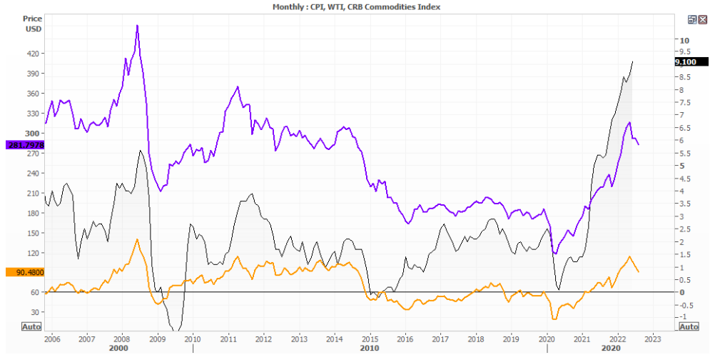6月份报告中美中不足的是,大宗商品价格大多走高。然而,下图显示油价(全球价格的一个关键通胀因素)和CRB指数连续第三个月走低。随着俄罗斯和欧洲之间的地缘政治仍在发挥作用,以及中国和台湾的复兴,我们应该对商品价格上涨保持警惕。但我们至少可以看到短期内的通缩压力尚未影响整体通胀。