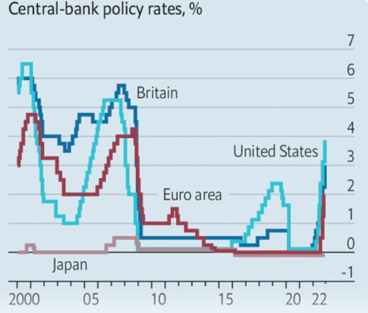 今年秋季,全球央行中的鹰派占据了上风,宣布了几十年前从未有过的加息幅度。自去年8月以来,20家主要央行总共加息近11个百分点,显示出近期货币政策的走向。日本央行是一个例外,因为它自2007年以来一直没有加息,而且预计短期内也不会加息,而俄罗斯和土耳其则下调了利率。