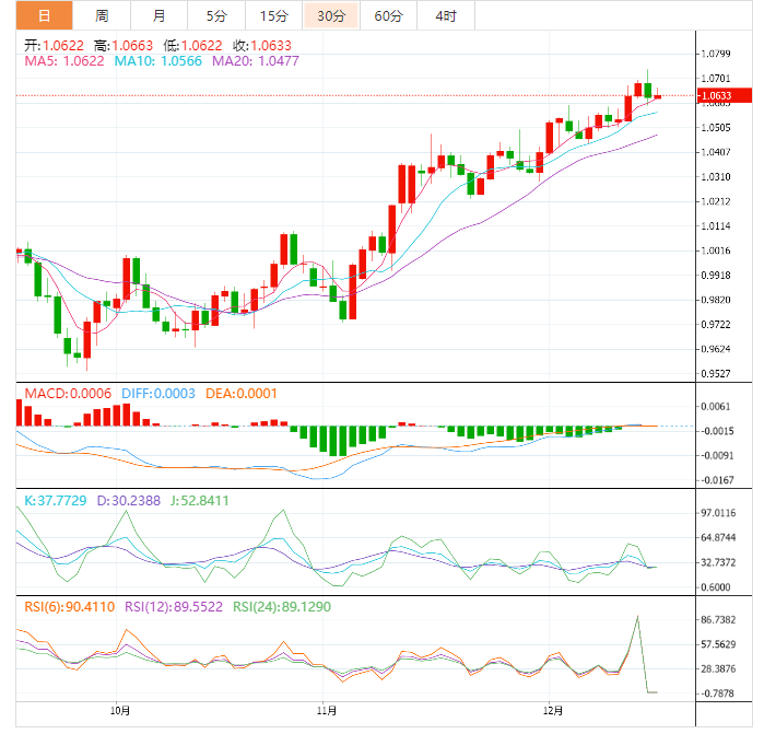 受乐观的欧元区PMI数据鼓舞,欧元兑美元扩大了1.0650上方的涨幅,欧元兑美元当天上涨了0.22%。
