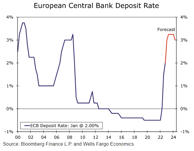 在1月份的《国际经济展望》中指出,由于暖冬和天然气储量充足,欧元区经济前景有所改善。德国经济在第四季度可能避免了收缩,过去两个月的情绪指标也有所改善。总体通胀也显示出下降的迹象,这应该会支持未来消费者支出的前景。我们还注意到,欧洲央行(ECB)目前是世界上最鹰派的央行,我们相信它将在下周兑现其鹰派言论。