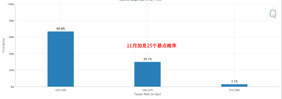 根据CME的美联储观察工具(见下图),当前市场预期美联储9月加息25个基点的概率低至13.5%,但如果美联储9月不加息,11月加息25个基点概率现在是30.1%。因此如果这次CPI数据出现意外走强,那么市场预期将存在很大的修正空间,这可能会对黄金、非美货币构成不小压力。