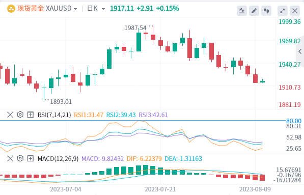 金价在最近突破了两周以来下跌趋势通道的底线后,仍处于被动状态,最近触及了七周以来的水平支撑区。值得注意的是,RSI接近超卖状态,位于14,与来自MACD指标的缓慢信号一起,对黄金价格的进一步下行构成了挑战。这同样凸显了即时支撑位,包括自6月22日以来在1915美元附近创下的多个水平,这反过来可能在事件前盘整之前挑战空头。