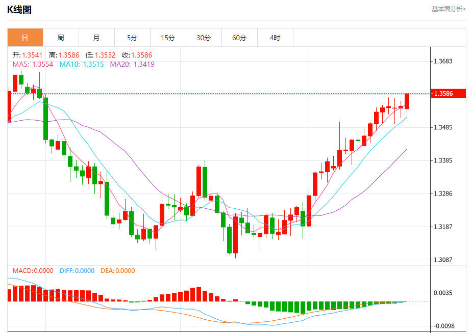 截至目前,美元/加元上涨0.27%,报1.3587。