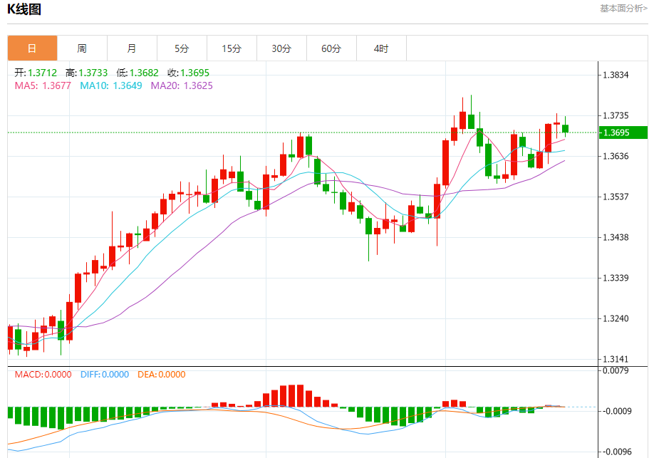 截至目前,美元/加元下跌0.17%,报1.3696。