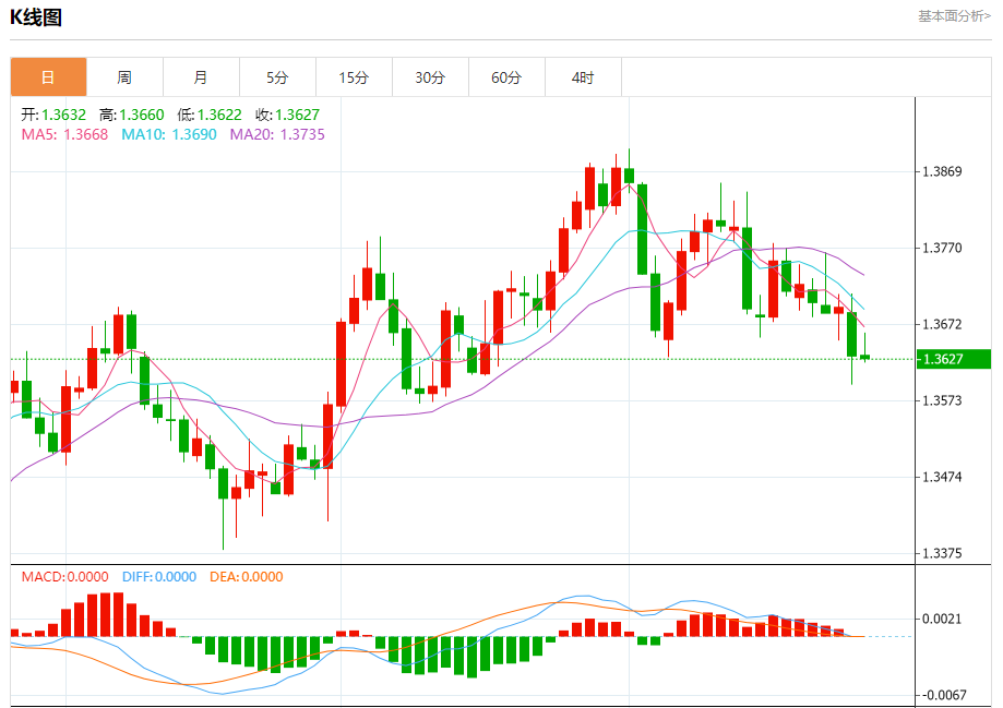 截至目前,美元/加元下跌0.02%,报1.3631。