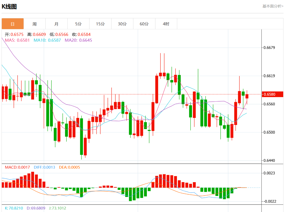 周一盘中,澳元/美元报0.6581,涨幅0.05%。
