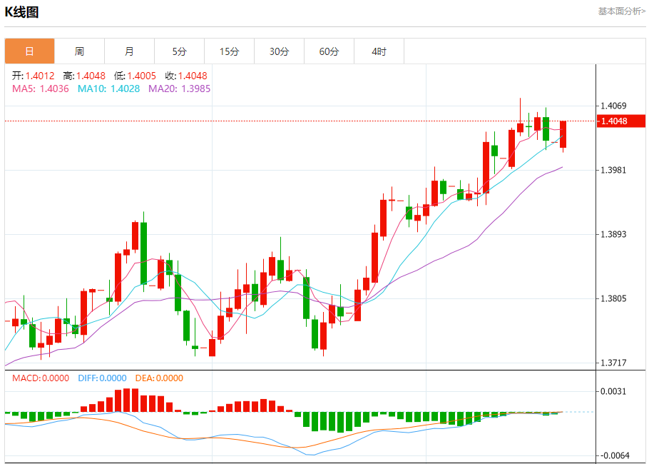 截至目前,美元/加元上涨0.20%,报1.4049。