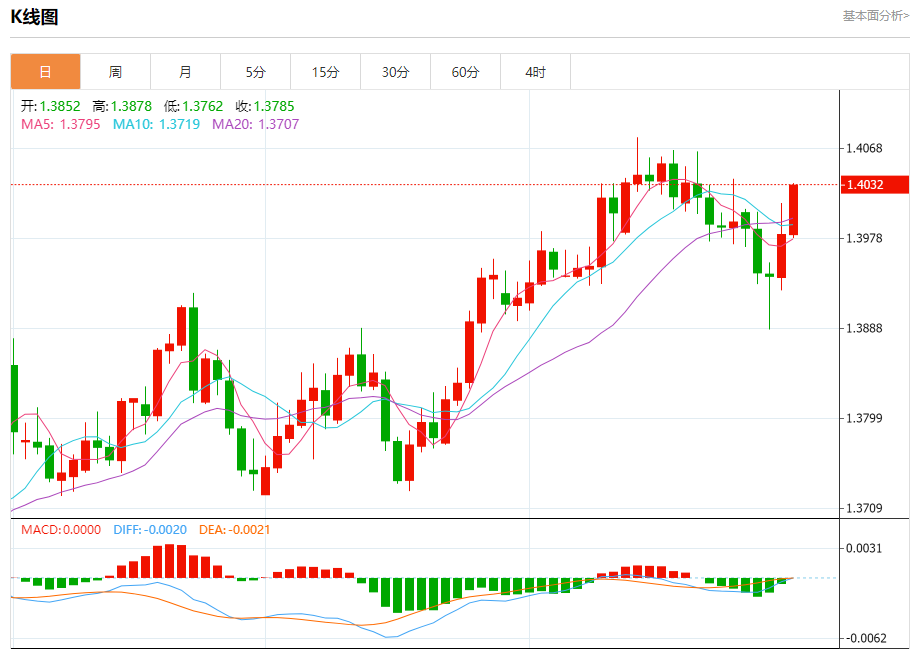 截至目前,美元/加元上涨0.35%,报1.4034。