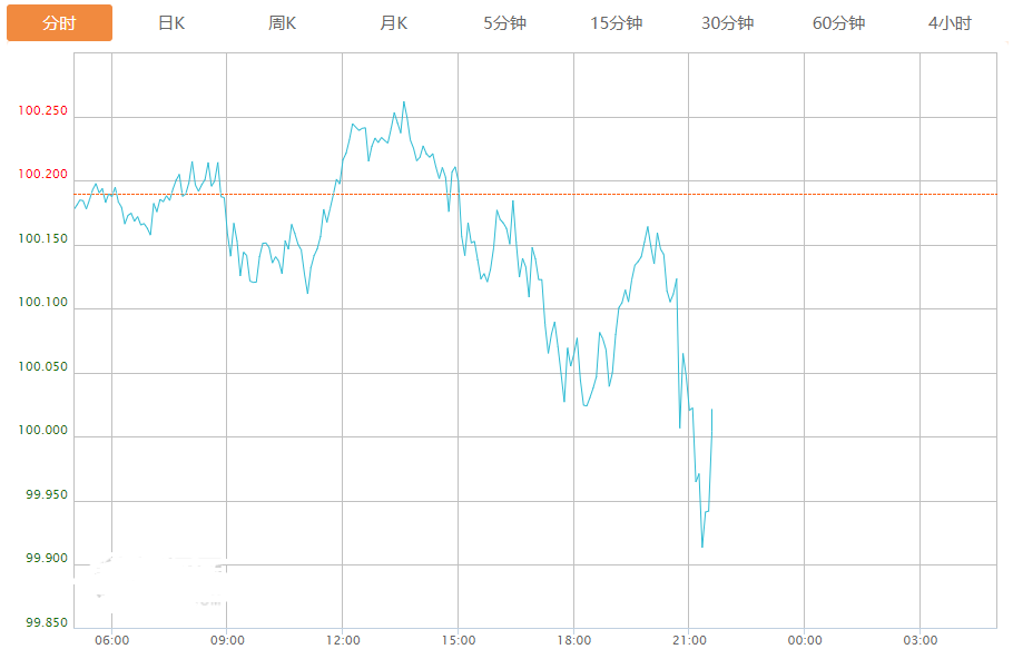 截至目前,美元指数下跌0.19%,报99.996。