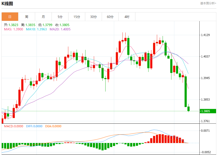 截至目前,美元/加元下跌0.13%,报1.3806。