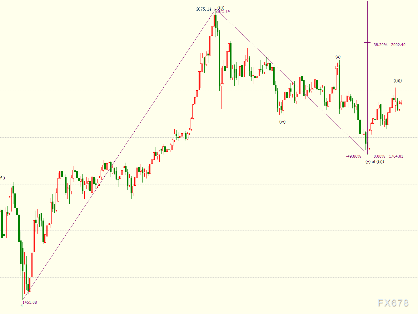 日线图上看,金价自1764美元开启上行((iii))浪走势,(i)浪是((iii))浪的子浪。((iii))浪的23.6%和38.2%目标位分别在1911美元和2002美元,((iii))浪是自1451美元开启的上行5浪的子浪。