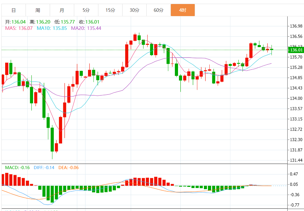 技术上,日图自MA20企稳反弹,但随机指标熊背离,对短线进一步上行保持谨慎。4小时图上行但上方面临前高136.65阻力。小时图上升斜率变斗,仍在反弹行情中。