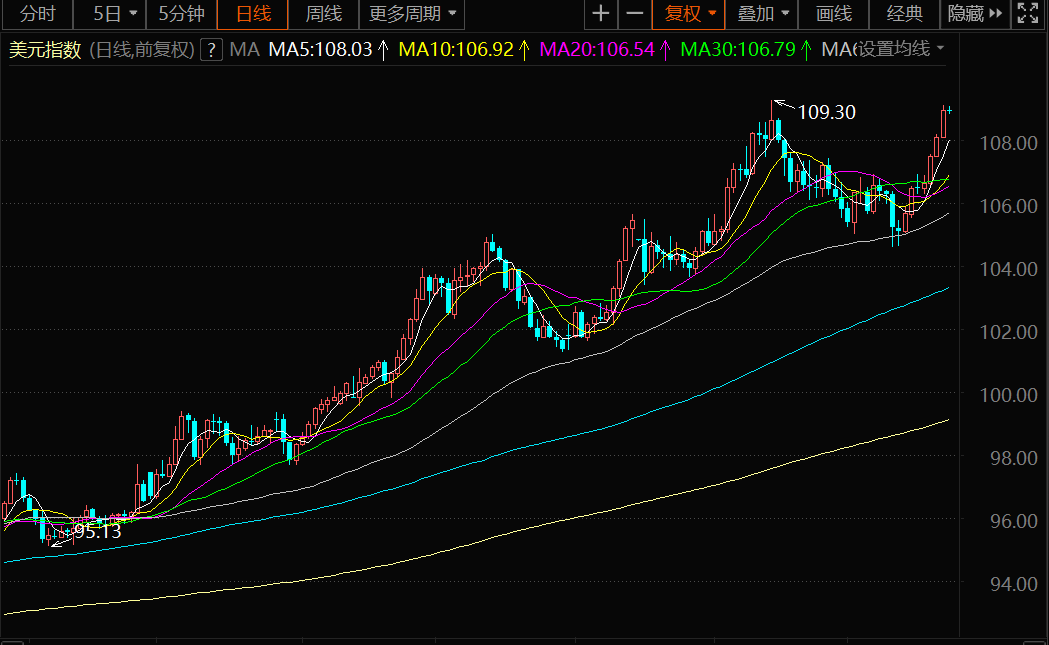 美元指数周二连续第5个交易日上扬,逼近周期高点109.30点,上次触及该区域是在2002年9月。