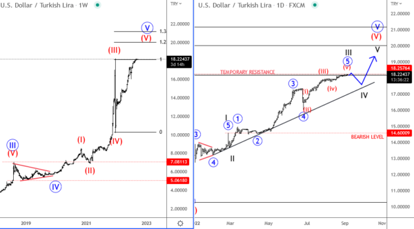 更高的度脉冲可能处于后期阶段,当前有五个子波,蓝色波浪V.第一个向上水平在20.00,多头可以减速,但下一个扩展目标即使在25和30上也显示出空间。