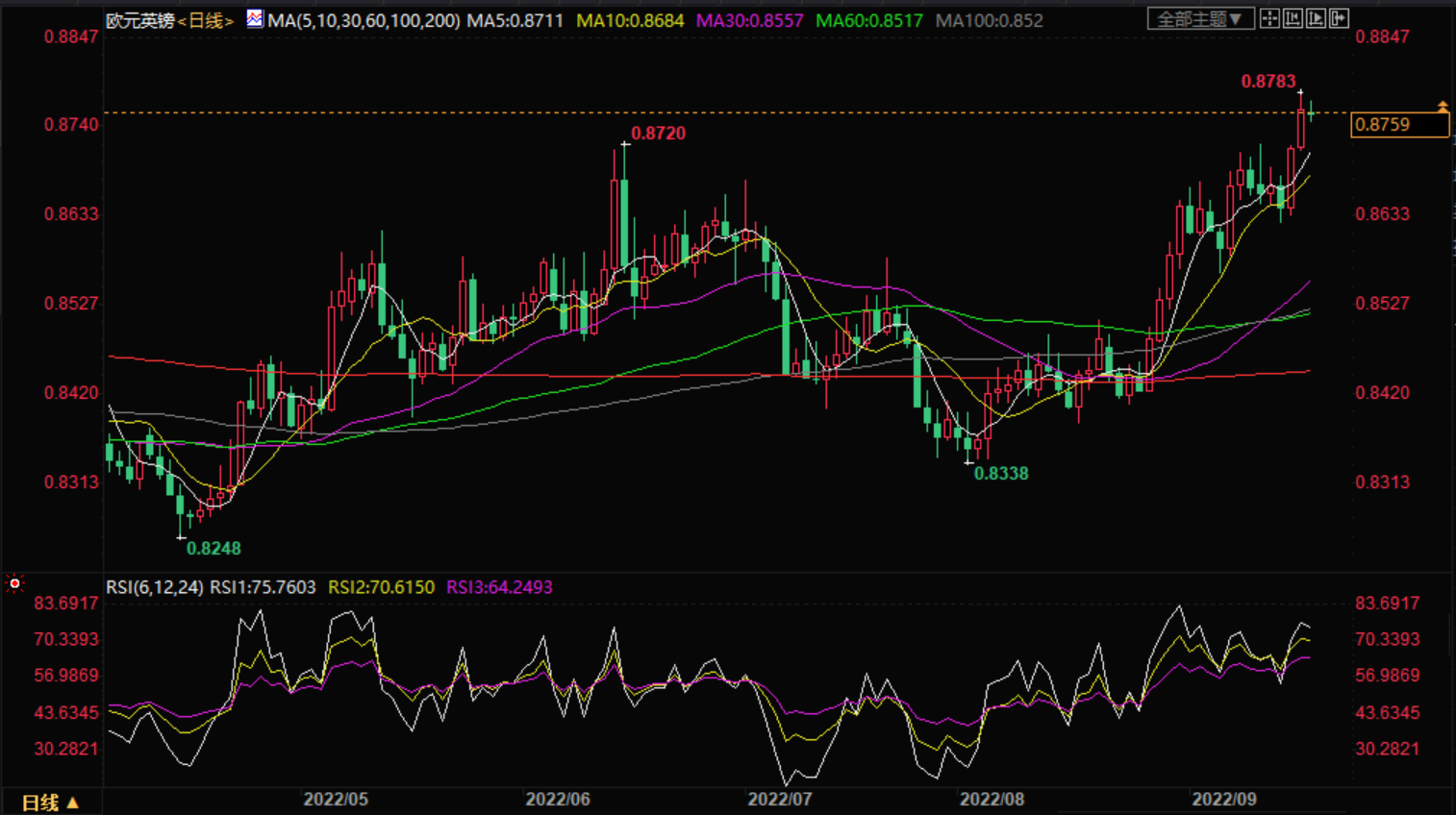 斐波那契回撤工具显示了更多的买家可能在等待加入上升趋势。61.8%的水平最接近于0.8685标记附近的趋势线和移动平均线的动态拐点。