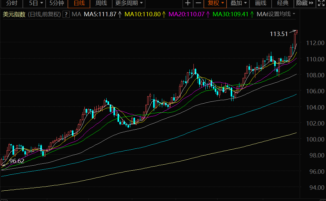 美元指数跟随短期国债收益率上涨,作为美联储下一步行动晴雨表的美国2年期国债收益率逼近4.35%区域,为2007年8月以来首次。