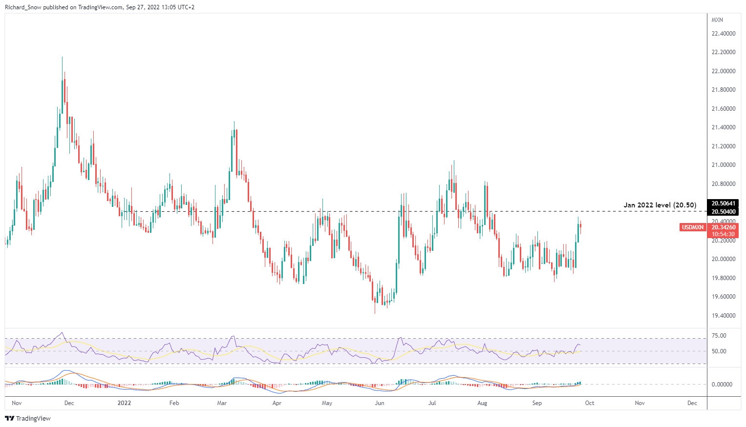 墨西哥早在去年6月就实施了10次加息中的第一次,试图抑制高于预期的通胀压力和预测。比索兑美元今年有时走弱,但到目前为止,2022年比美元走高。该货币对最近有所回落,并接近了20.50的新年水平。