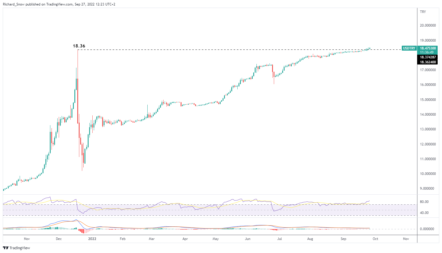 美元/土耳其里拉图表显示,该货币对稳步攀升,突破了2021年第四季度的峰值。