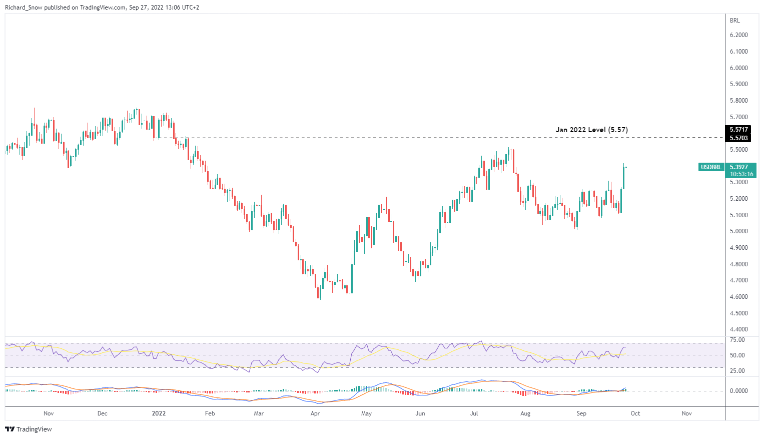 巴西雷亚尔与比索一样,表现优于美元,但迄今为止在2022年的大部分时间里一直表现如此。上周,巴西央行在8月通胀率从10.07%降至8.73%后维持利率不变,这是一年来首次恢复到单一数字。与比索类似,雷亚尔兑美元贬值,该货币对接近1月3日的5.57。