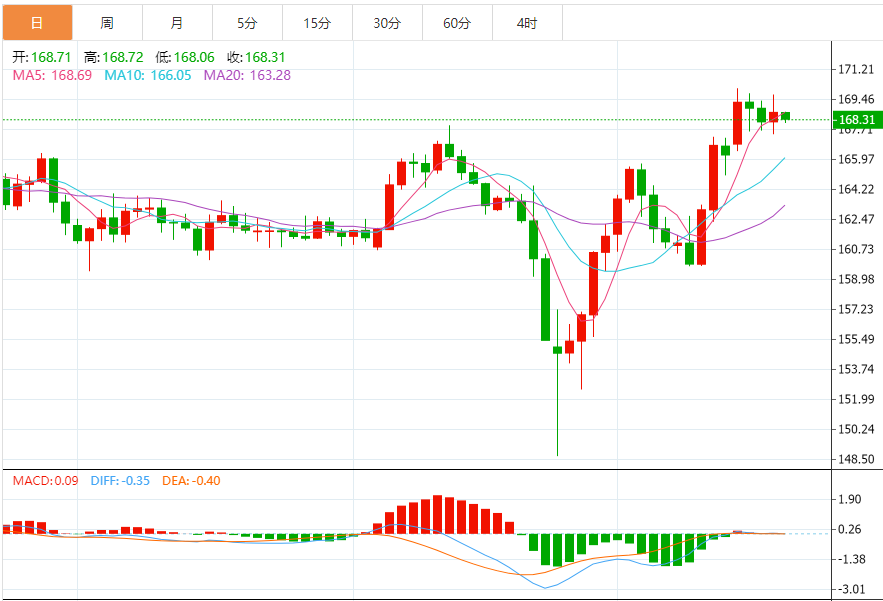 今日预期交易区间:处于167.00至170.70之间。