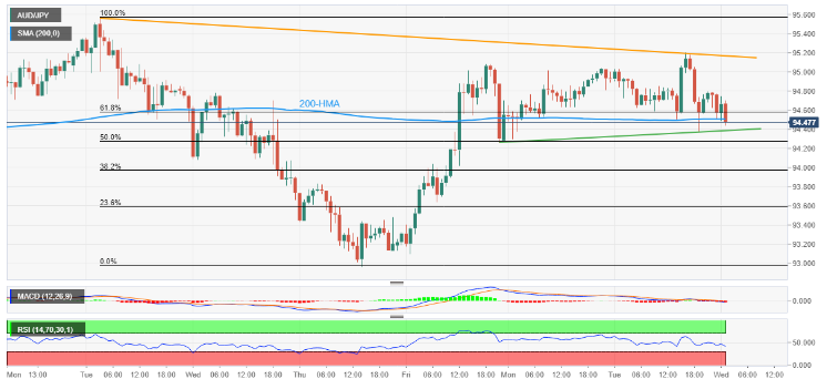 基本面:中国整体消费者价格指数(CPI)降至2.1%,期值2.4%,前值为2.8%。然而,生产者价格指数(PPI)升至-1.3%,而预期为-1.5%,前值为0.9%。应该注意的是,中国消费者价格指数下行和澳元兑日元下跌,使得空头将测试200-HMA。同样构成下跌目标的周一上行支撑线94.40附近。
