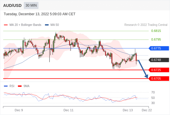 澳元/美元汇率今日分析:在 0.6775 之下,看跌,目标价位为 0.6725 ,然后为 0.6705 。