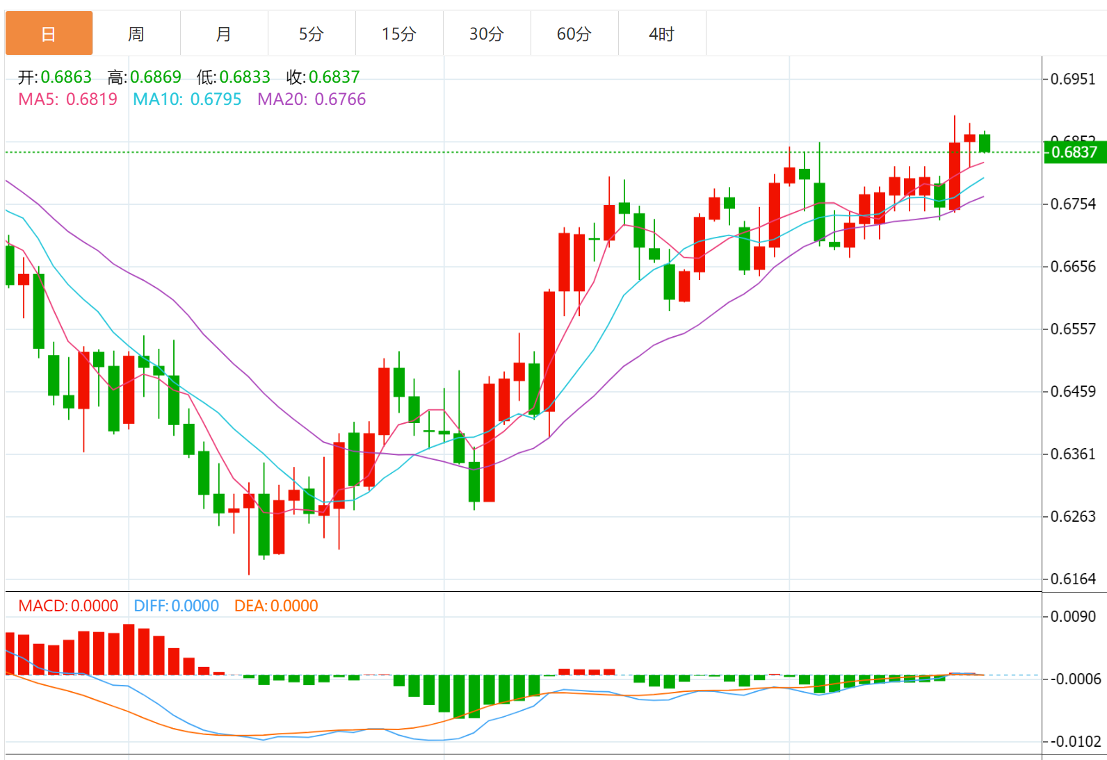 技术上,尽管澳元/美元自数日高位出现180度大反转,测试6月以来下降倾向阻力(截至发稿时处在0.6880附近),但11月高位0.6800附近是吸引空头的关键水平。