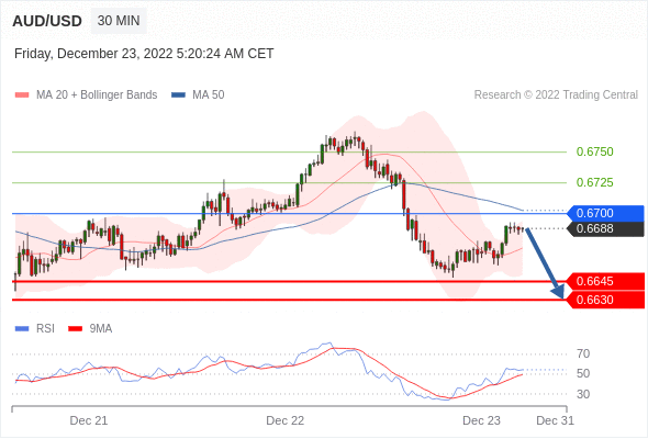 澳元/美元汇率今日分析:在 0.6700 之下,看跌,目标价位为 0.6645 ,然后为 0.6630 。在 0.6700 上,看涨,目标价位定在 0.6725 ,然后为 0.6750。