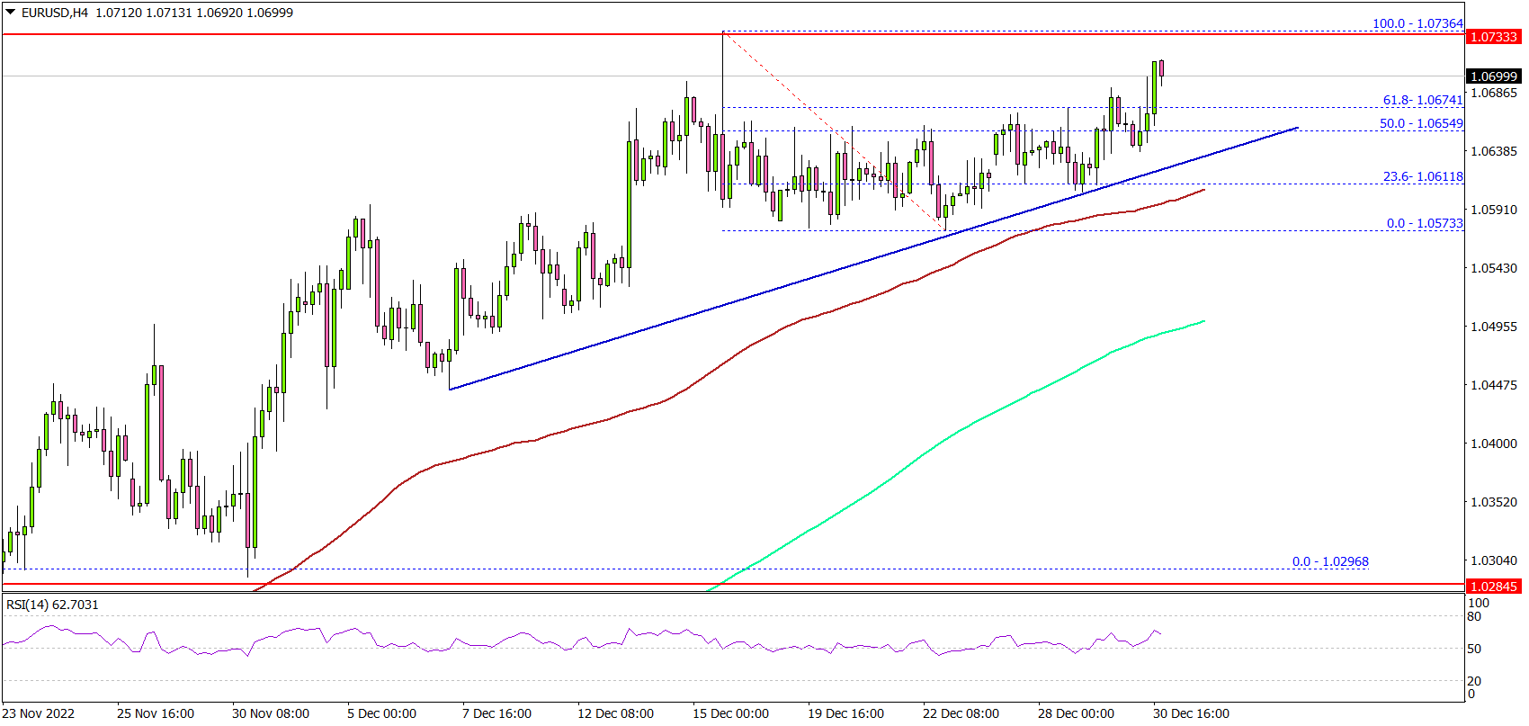 从4小时图表来看,该货币对能够攀升至1.0620阻力区上方。该货币对仍远高于 1.0600 水平、100 简单移动平均线(红色,4 小时)和 200 简单移动平均线(绿色,4 小时)。