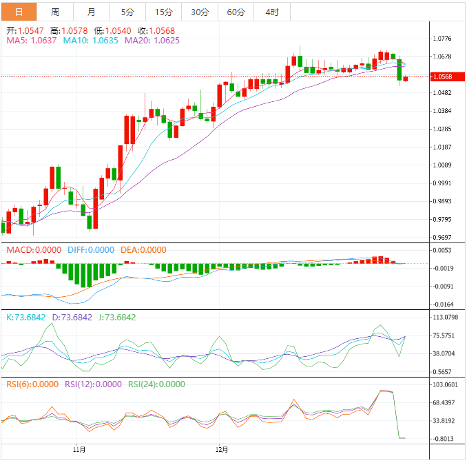 欧元兑美元当日收于上升趋势线支撑位下方,随后收于1.0630,证实了对称三角形的击穿。