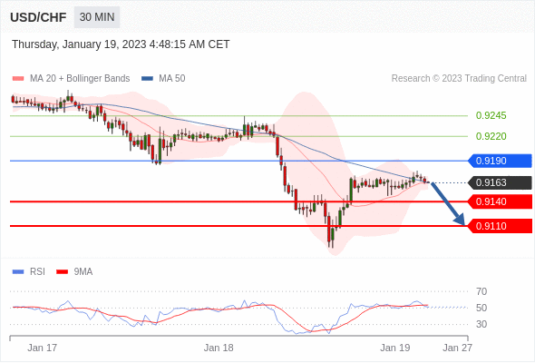 美元/瑞郎汇率今日分析:在 0.9190 之下,看跌,目标价位为 0.9140 ,然后为 0.9110 。在 0.9190 上,看涨,目标价位定在 0.9220 ,然后为 0.9245。