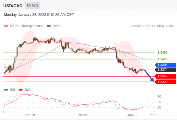 周一(1月23日)盘中, 美元/加元暂报1.3377,跌0.0003,跌幅0.02%。