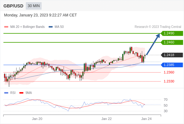 英镑/美元汇率今日分析:在 1.2385 之上,看涨,目标价位为 1.2460 ,然后为 1.2490 。备选策略: 在 1.2385 下,看空,目标价位定在 1.2360 ,然后为 1.2330。