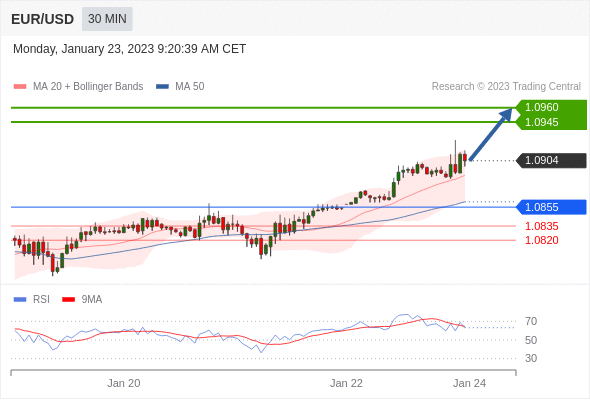 欧元/美元汇率今日分析:在 1.0855 之上,看涨,目标价位为 1.0945 ,然后为 1.0960 。在 1.0855 下,看空,目标价位定在 1.0835 ,然后为 1.0820。