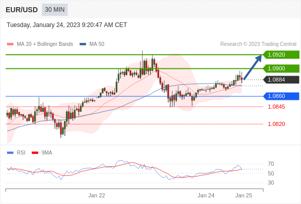 欧元/美元汇率今日分析:在 1.0860 之上,看涨,目标价位为 1.0900 ,然后为 1.0920 。在 1.0860 下,看空,目标价位定在 1.0845 ,然后为 1.0820。