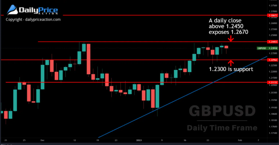 和欧元兑美元一样,英镑兑美元上周也保持横向震荡。该货币对仍低于去年12月的高点1.2450。