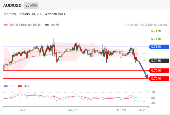 澳元/美元汇率今日分析:在 0.7120 之下,看跌,目标价位为 0.7060 ,然后为 0.7040 。在 0.7120 上,看涨,目标价位定在 0.7140 ,然后为 0.7160。
