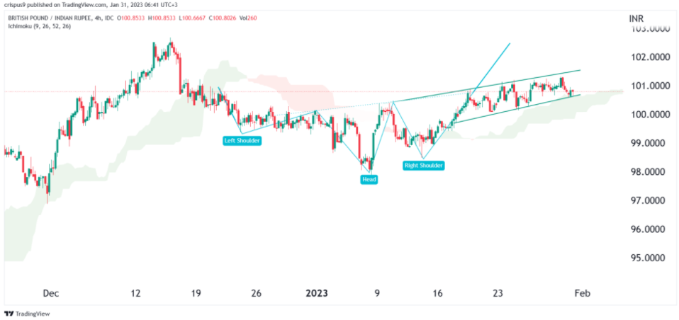 在1D图表上,我们看到英镑/印度卢比汇率在过去几个月一直处于整体看涨趋势。从去年9月的最低点85.05,到12月13日的最高点102.72。价格已经突破98.31(1月6日的最低价和2022年5月的最高价)。它也略微高于78.6%的斐波那契回撤水平98.91