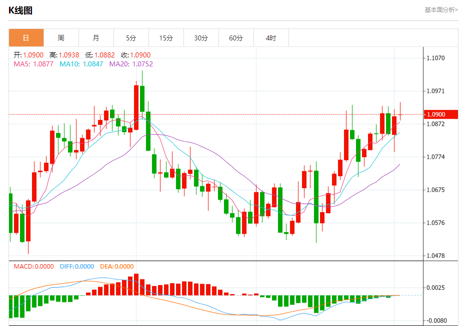 周二盘中,欧元/美元报1.0906,涨幅0.10%。