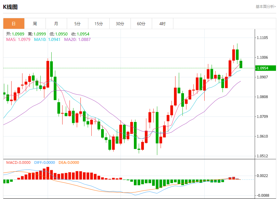 周一盘中,欧元/美元报1.0954,跌幅0.34%。