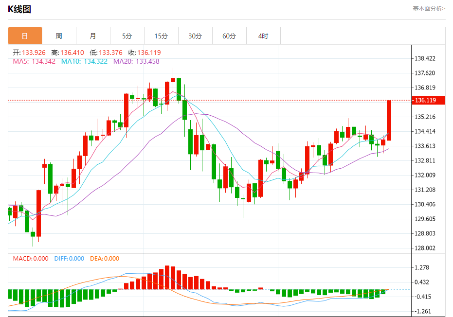 周五盘中,美元/日元报136.129,涨幅1.61%。
